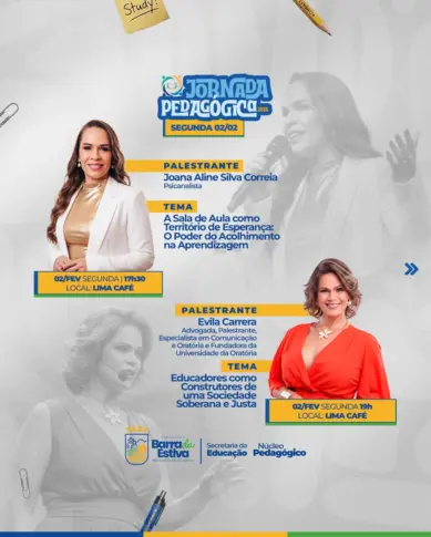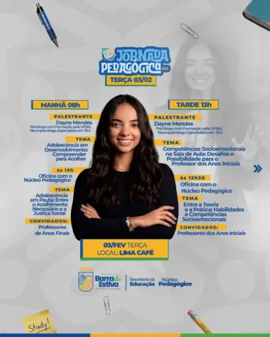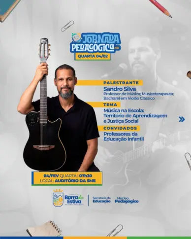 A Secretaria Municipal de Educação de Barra da Estiva realizará a Jornada Pedagógica 2026, voltada aos professores e às equipes gestoras da rede municipal de ensino. O evento será um espaço de encontro, escuta e reflexão, com foco no fortalecimento do compromisso com a educação pública de qualidade.