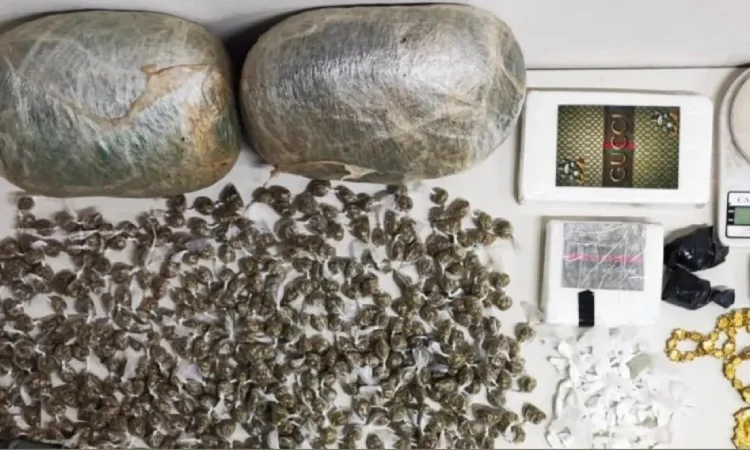 Durante a abordagem e a busca no imóvel, os policiais apreenderam cerca de 4,7 quilos de entorpecentes, entre maconha e cocaína, além de oito munições calibre 9mm, balanças de precisão e uma quantia em dinheiro.