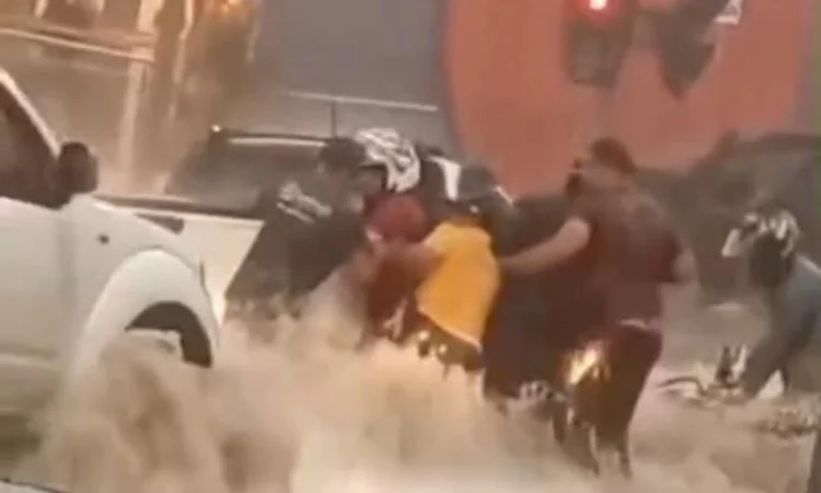 Na tarde desta quinta-feira (18), um casal que trafegava de motocicleta foi surpreendido por uma forte enxurrada em Vitória da Conquista, no Sudoeste da Bahia. A força da água arrastou os dois pela via alagada até colidirem com um carro que passava pelo local no momento do ocorrido.