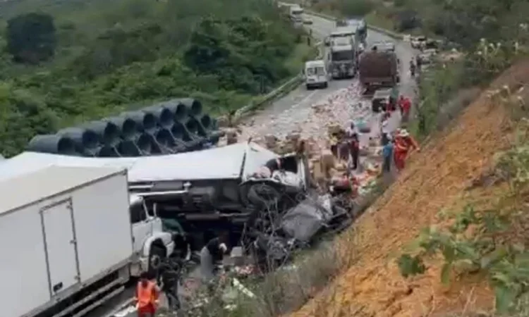 Um acidente envolvendo uma carreta, um caminhão e um veículo de passeio travou o trânsito e deixou pessoas feridas no início da tarde desta sexta-feira (20), na Rodovia Santos Dumont (BR-116), no trecho entre os municípios de Irajuba e Brejões, Bahia.