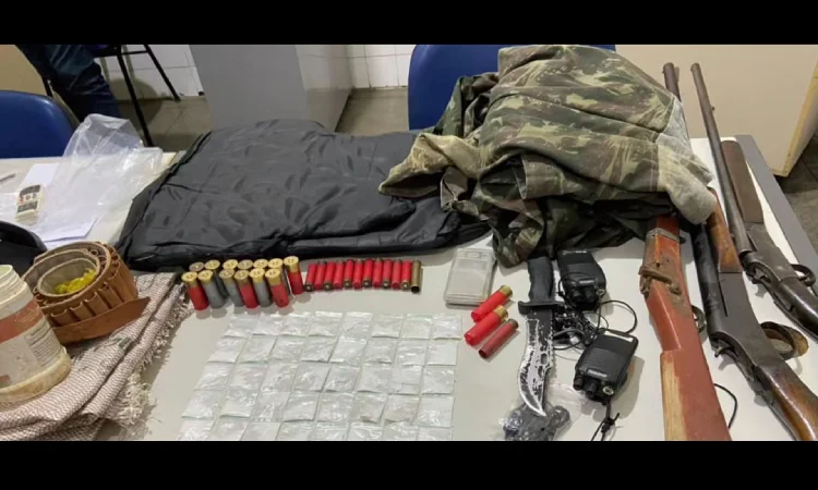 Durante as buscas, um dos suspeitos foi localizado em um acampamento improvisado. No local e nas proximidades, os policiais apreenderam espingardas de calibres 12, 28 e uma arma artesanal, além de munições de diversos calibres, 40 papelotes de substância análoga à cocaína, placas balísticas, rádios comunicadores, uma balança digital, uma motocicleta, roupas camufladas e outros materiais.