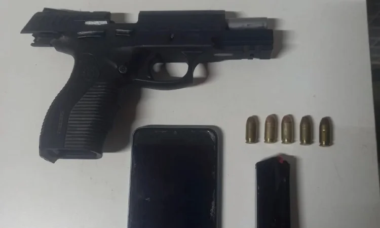 Com o suspeito, foi apreendida uma pistola Taurus calibre .380, com numeração suprimida, além de cinco munições intactas.