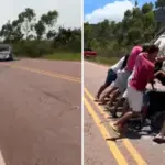 Veículo incendiado é retirado da BA-142 por moradores em Barra da Estiva