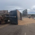 Carreta carregada de soja tomba após colisão na BA-026 entre Maracás e Planaltino